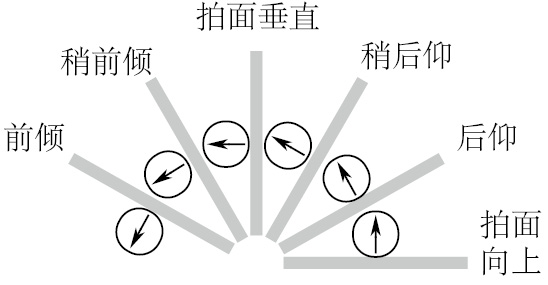 拍面前倾:指球拍击球靠近1点。